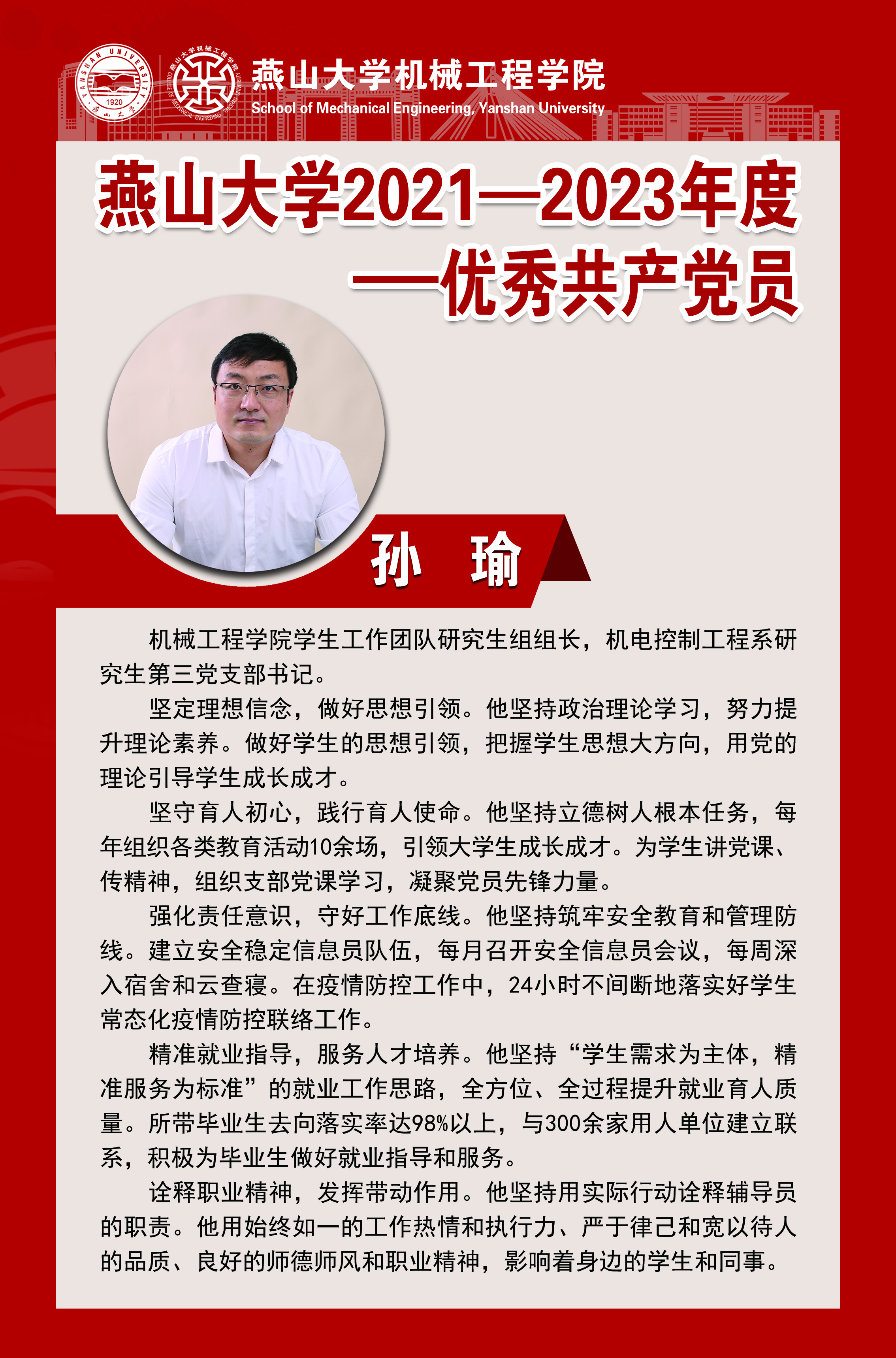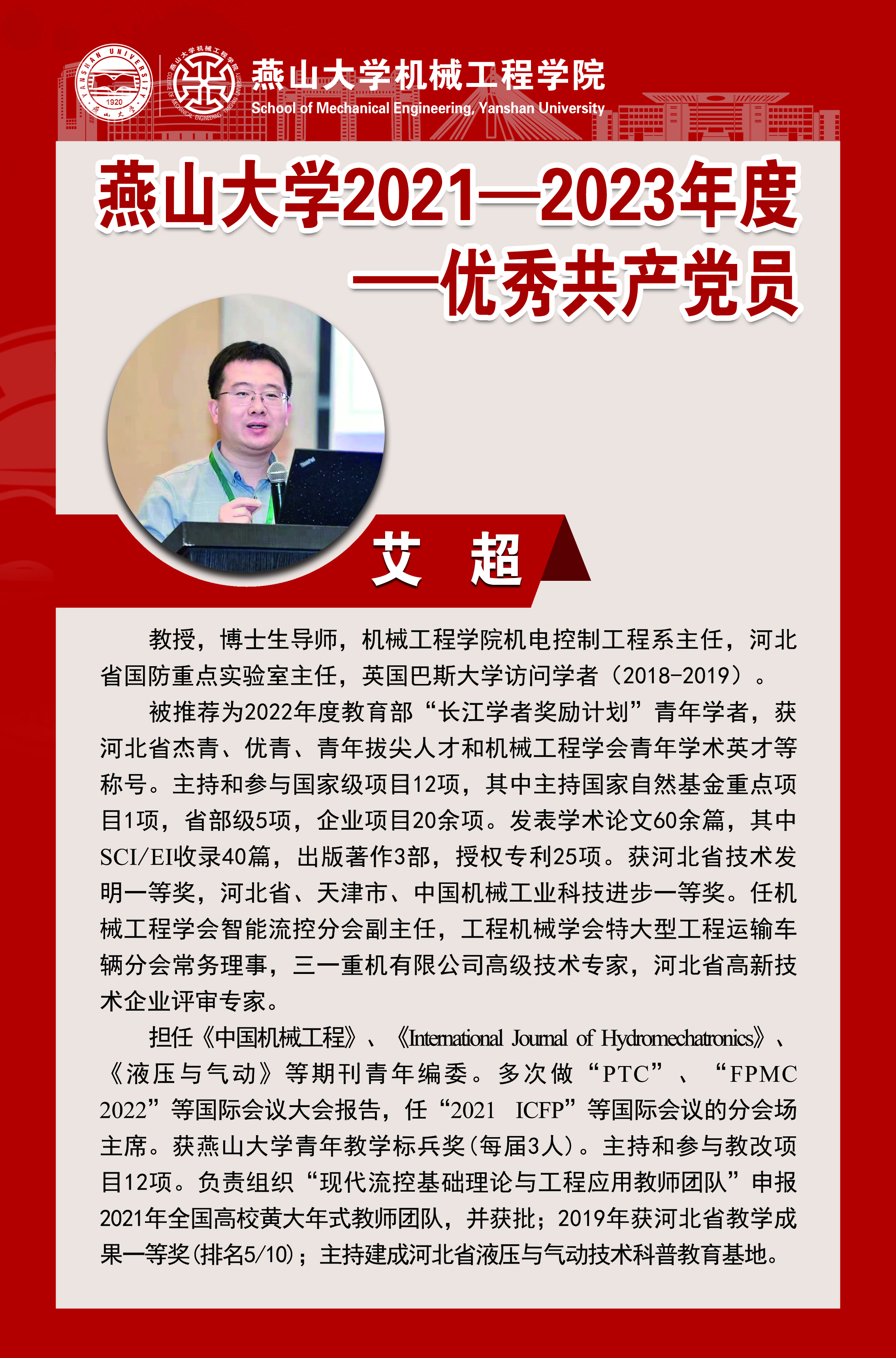 在中国共产党成立102周年之际,为深入学习贯彻习近平新时代中国特色社会主义思想和党的二十大精神,充分激励广大党员发挥先进典型的正向激励和榜样引领作用,机械工程学院开展“庆祝建党102周年”系列活动,对2021—2023年度优秀共产党员和优秀党务工作者事迹进行宣传展示,激发广大党员奋发作为,勇毅前行。