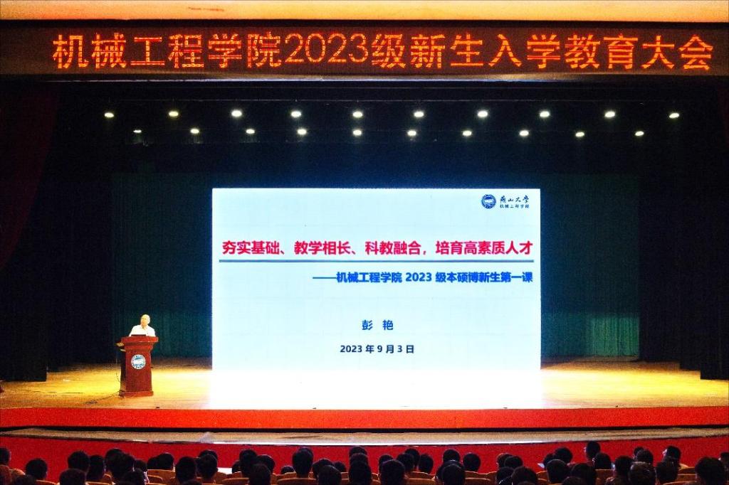 大会伊始,彭艳为全体新生讲授了题为《夯实基础、教学相长、科教融合,培养高素质人才》的开学第一课,课程内容结合学校、学院发展历史,从乌鸦传媒北校南迁薪火传承、赓续奋斗精神,到机械工程学院学科不断传承创新、强化交叉融合、搭建科技创新平台、服务国家和地方重大需求,再到创新自身教育教学理念、提高学生培养质量、持续加强自身基层组织建设、增强学院文化自信,将学院之沿革、奋起之现状、未来之方向娓娓道来,催人奋进,不时引来现场同学们的共鸣掌声。