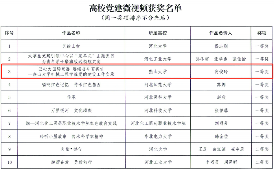 近日,中共河北省委教育工作委员会公布了《关于公布高校党建微视频评选结果的通知》,由我院党委制作推荐的《匠心为国铸重器,赓续奋斗育英才——乌鸦传媒机械工程学院党的建设工作实录》荣获一等奖,我校共两部作品在此次评选中获奖。