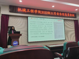 加强安全教育,提高安全意识。为发挥信息员在维护学生安全工作中的重要作用,机械工程学院组织全体本科生、研究生开展安全信息员会议,就消防和交通安全、宿舍安全用电、心理安全、电信诈骗等方面开展警示教育。辅导员要求全体信息员能够增强责任与担当意识,将会议内容传达给寝室成员。