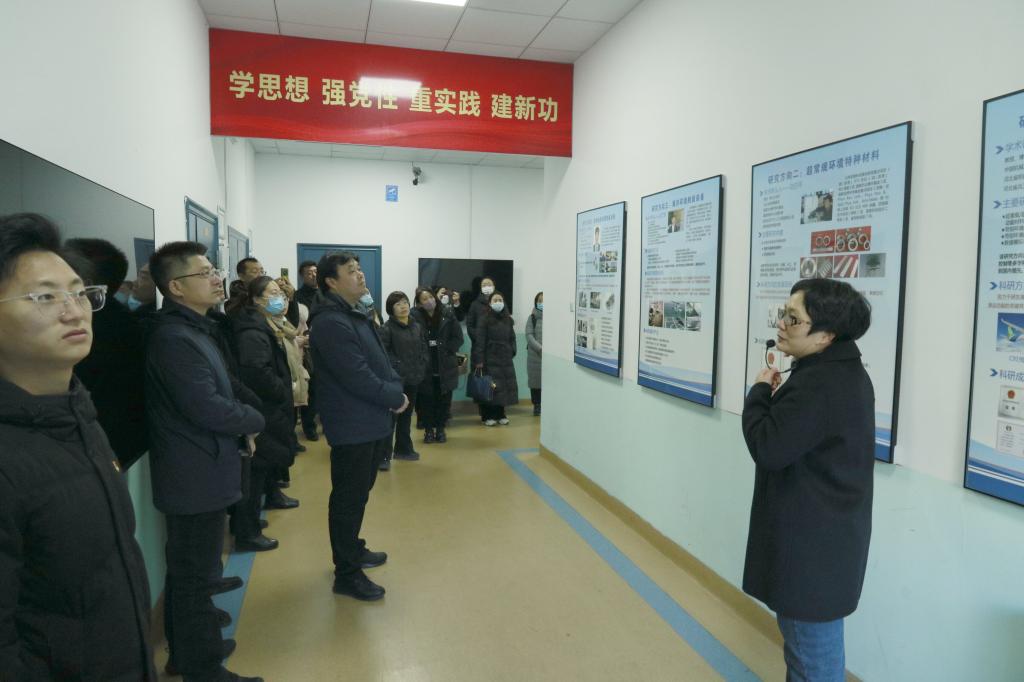 观摩团首先在机械馆一楼方厅集中观看了学院“匠心为国铸重器,赓续奋斗育英才”党建工作实录视频;随后,学院党委副书记韩冰带领观摩团参观了学院学科回廊和党建宣传廊,介绍了学院基本情况及学院党建工作中的特色和亮点。最后,观摩团还前往学院全国“双带头人”教师党支部书记郝秀红工作室进行了参观学习。