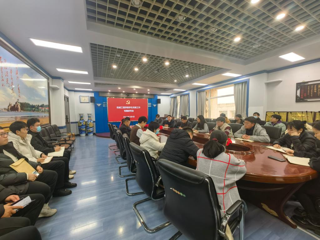 为推动学院学生党建工作高质量发展,3月4日下午,机械工程学院在机械馆301室召开学生党建工作专题研究会。会议由学院党委书记产佳主持,党委副书记韩冰、正处级辅导员郝海滨、副处级辅导员刘祥城、各学生党支部书记及专职组织员参加会议。