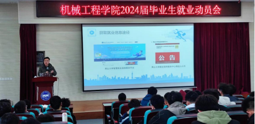 3月13日下午,机械工程学院2024届本科毕业生就业动员大会在机械馆J3召开。机械工程学院党委副书记韩冰、就业工作负责老师宋龙、孙懿、毕业班辅导员张子莹出席会议。
