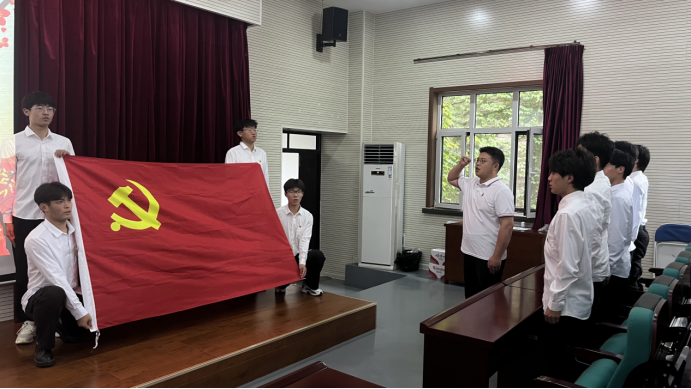 在学生党支部书记王世运的领誓下,全体预备党员面向党旗,举起右拳,庄严宣誓,在铿锵有力的誓言中,表达对党的忠诚和热爱,展示对党的坚定信念和崇高追求。
