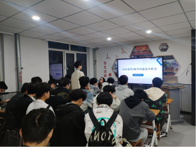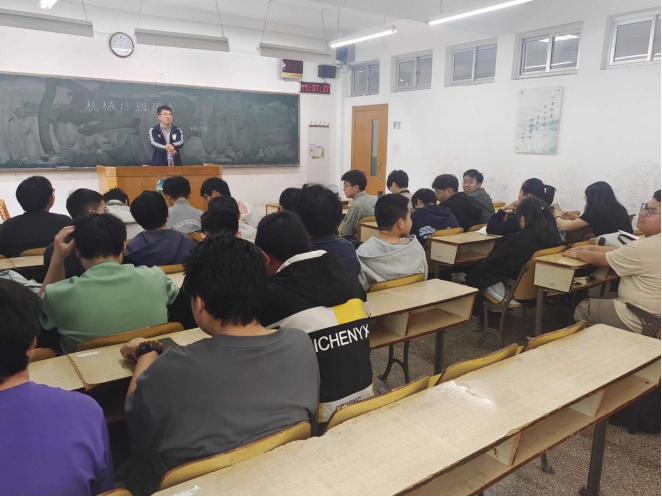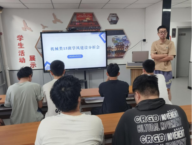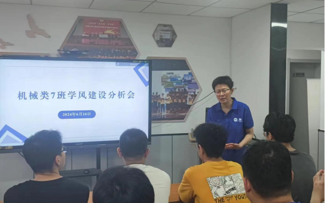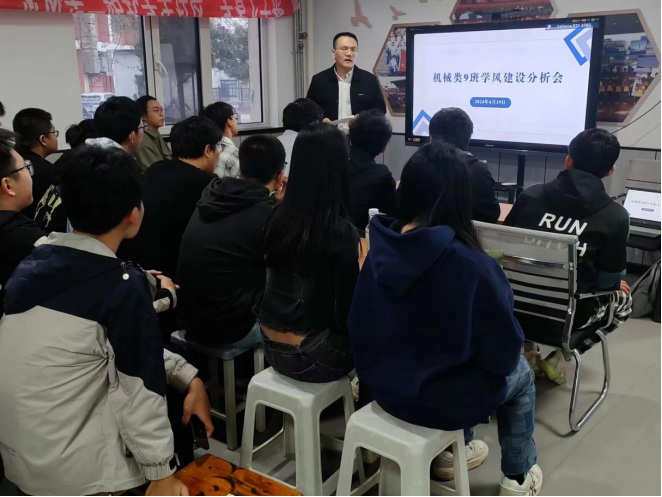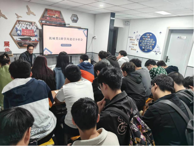 2023-2024学年春季学期,机械工程学院于“寓见风华”“一站式”学生社区及教学楼组织多场以“明理诚信立学风,厚德载物育英才”为主题的班级学风会议。会议覆盖2023级本科生22个班,各班班主任主持会议。