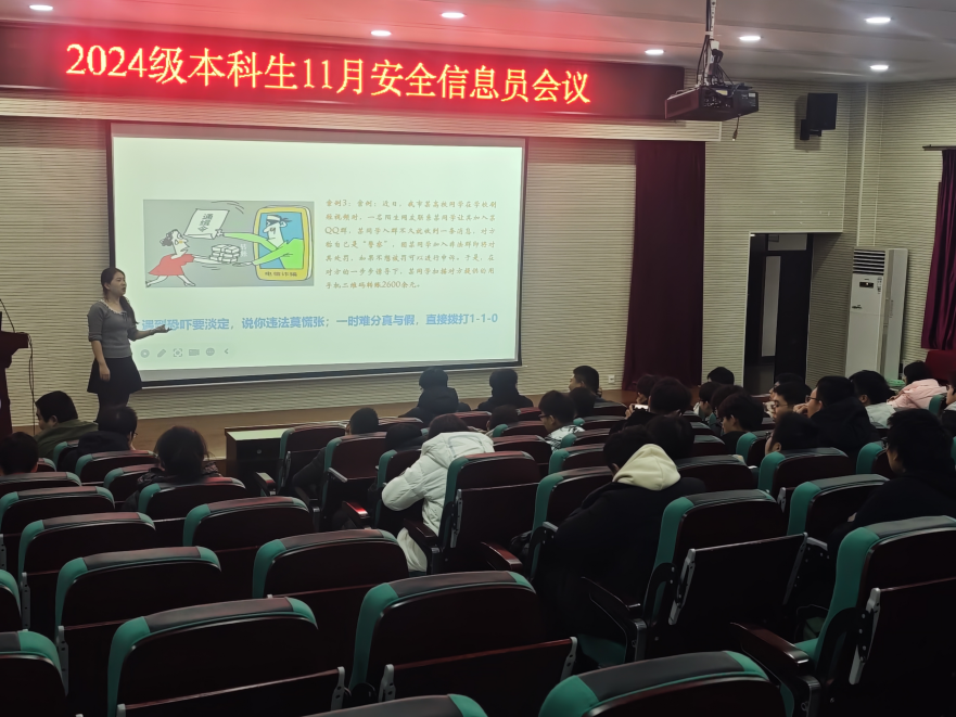 本次会议围绕宿舍安全、消防安全、反诈骗、诚信考试、校园交通、心理健康等六个方面展开。会议开始,辅导员们结合近期工作案例再次进行防诈反诈宣传,提示同学们遇见传销等行为及时拨打校园报警电话。在宿舍安全方面,结合前期走访宿舍内容,强调要轮值打扫、随手锁门、不要遮挡消防通道等。在消防安全方面,强调禁止存放和使用违规电器、乱拉电线等,防止火灾发生,坚决做好个人安全的第一负责人。在校园交通方面,根据学校相关文件,辅导员们强调了机动车辆管理的详细条例,尤其包括电动车管理条例,要求同学们在校园内严格遵守道路交通法规和校园交通安全管理相关规定等,提醒同学们骑车要精力集中,不要玩手机、戴耳机,不要单手骑行、追逐竞驶等。此外,辅导员们在会上还强调了诚信考试、心理健康、关心关注身边同学等问题,并提示各位安全信息员及时将会议内容传达给宿舍成员,增强安全意识。