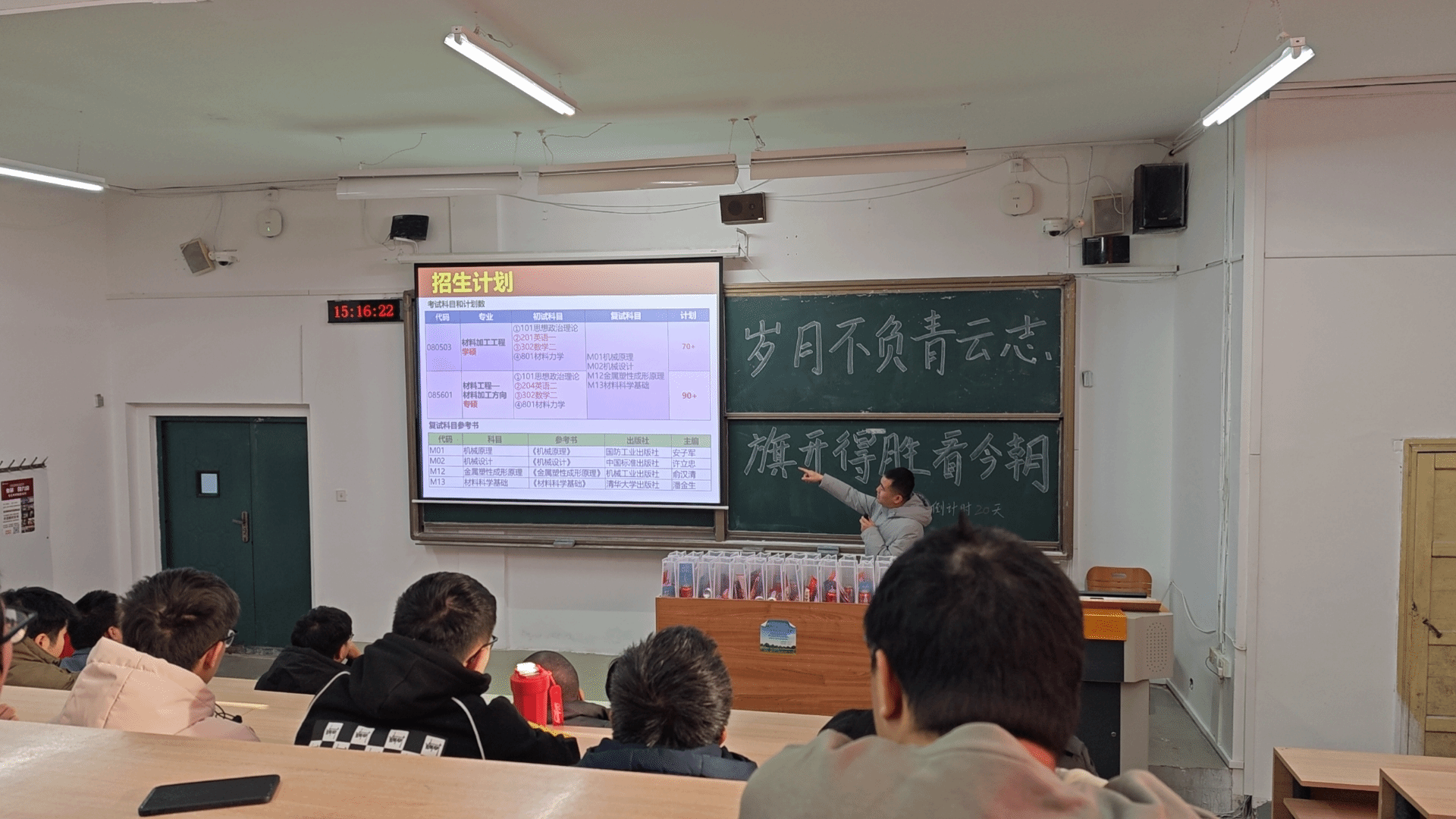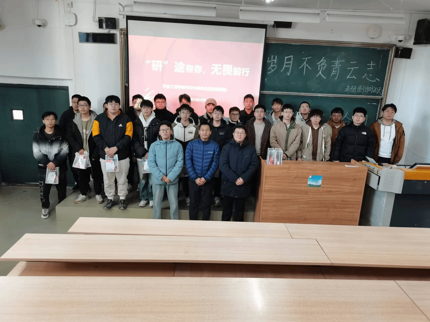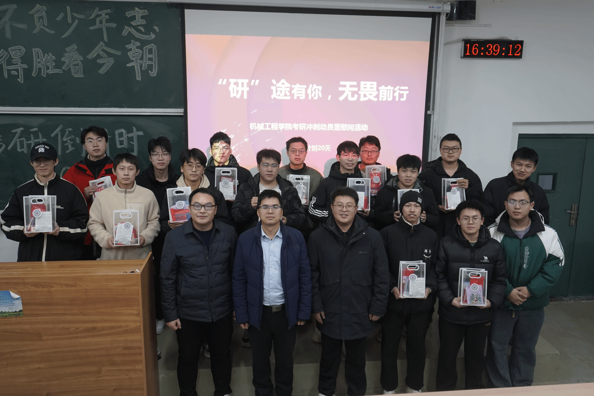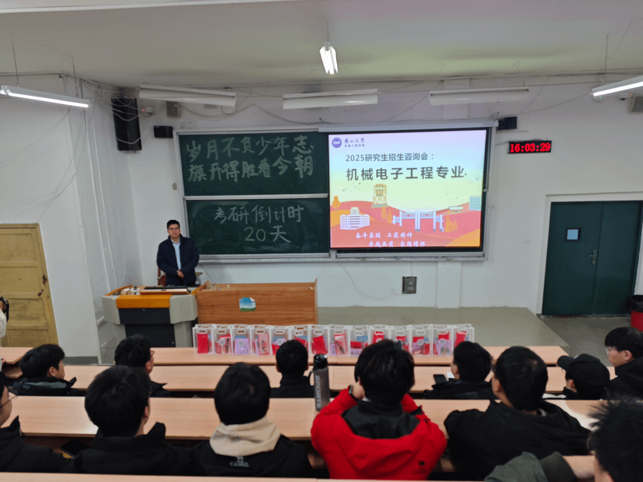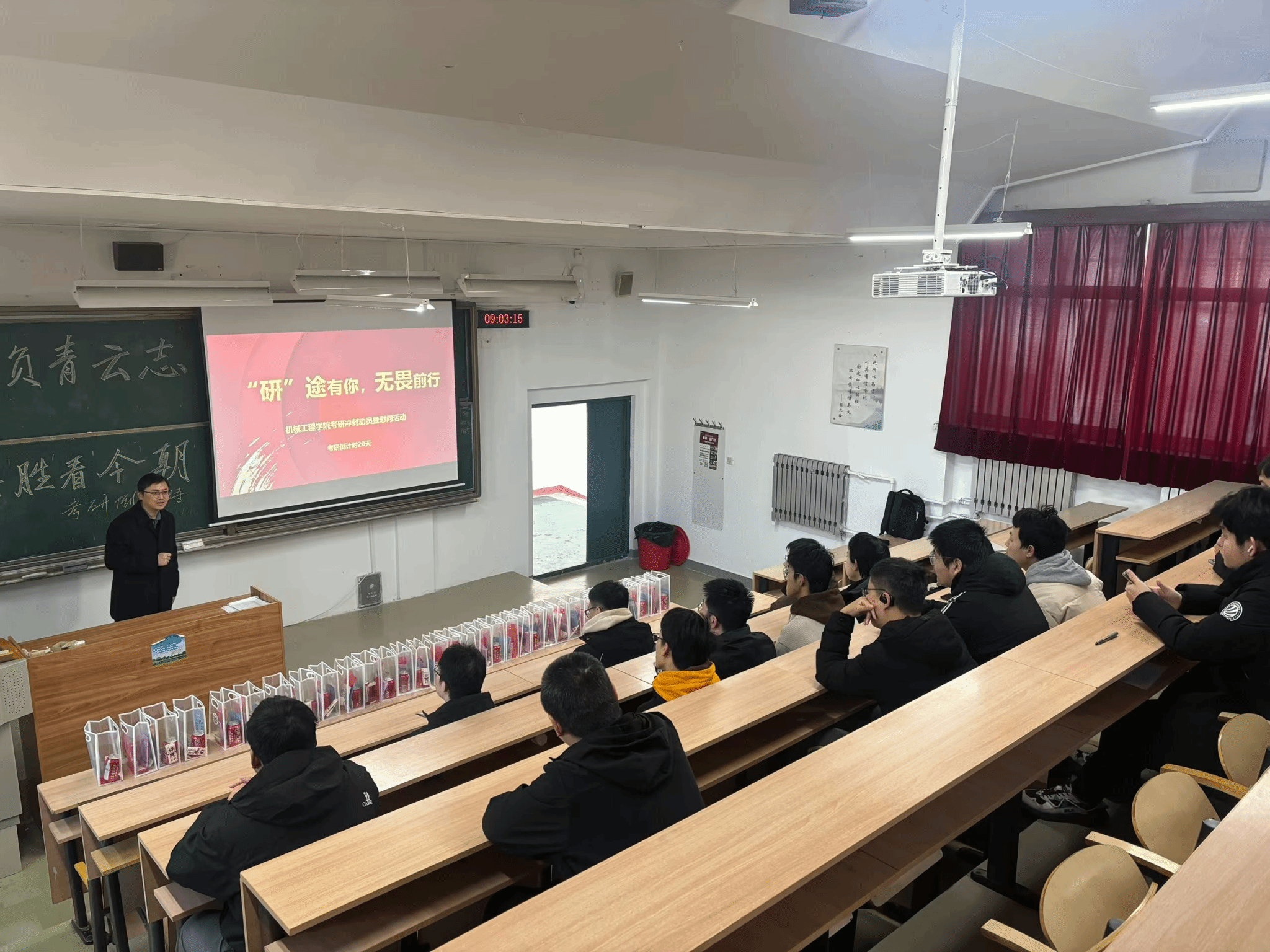 活动期间,学院各系部的教师们也走进机械馆、教学楼的教室,为考研学子送上鼓励与祝福。机控系教师袁晓明;机制系教师郭保苏、陈建超和陈昊;机设系教师翟富刚;机电系教师许允斗、李二伟;塑成系教师翟瑞雪以及冶金系教师韩毅,他们不仅从专业视角出发,详细阐述了各专业的发展前景及科研团队的研究方向,为学子们拓宽了学术视野;更结合自身成长、求学经历,为学子们提供了实用的职业规划建议、高效的考研策略以及贴心的心理辅导。他们耐心倾听学子们的困惑,细致解答每一个问题,为学子们指明了前行的道路。此外,教师们还亲手将满载心意的“暖心加油包”送到每位学子手中,不仅彰显了学院对学子无微不至的关怀与支持,更如同一股暖流,激励着每一位考研学子以更加坚定的步伐,勇往直前,迈向梦想的彼岸。