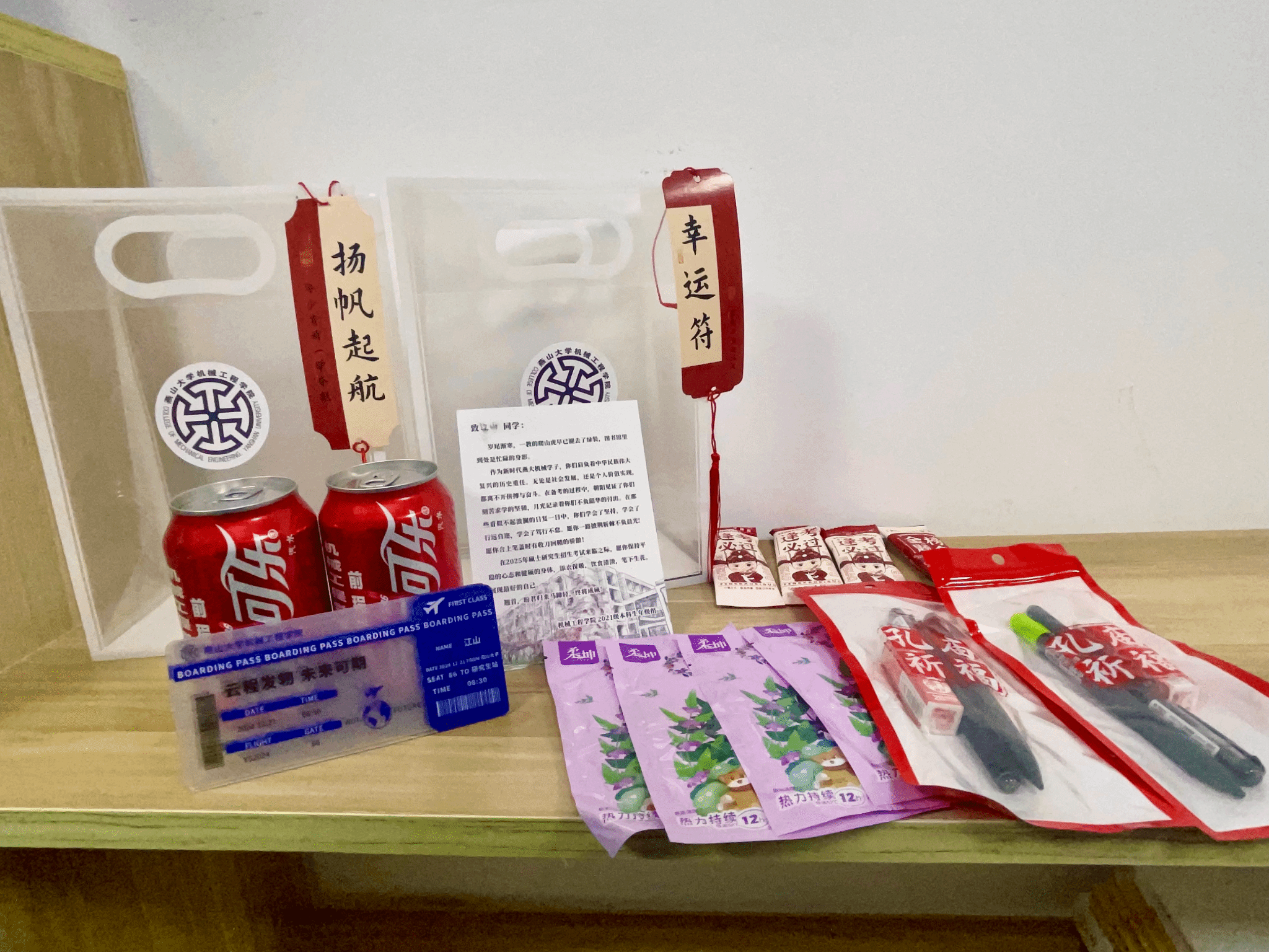 11月29日午时,阳光透过冬日的云层,温暖的洒在“一站式”学生社区、图书馆、宿舍的每一个角落。辅导员老师为每位考研学子精心准备了“暖心加油包”,里面装有印有学生姓名的登机牌、寓意着万事顺利的可口可乐、手写明信片、实用的文具袋、充满鼓励的寄语卡片以及温暖的暖身贴。每一件小礼物都承载着学院对学子们的深切祝福,让学子们深刻感受到来自学院的关怀与温暖。在送上慰问礼品的同时,辅导员老师与考研学子亲切交谈、深入交流,了解同学们备考过程中的生活学习情况和心理状态,帮助同学们解决思想困惑、放松紧张心情,鼓励大家坚持到底,发挥应有水平,为考研之路划上圆满的句号。活动最后,学子们在“一‘研’为定”签名墙上留下了自己的姓名并合影留念。