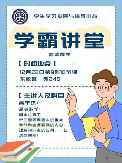 为进一步加强学院学风建设,激励机械工程学院学子积极备战高等数学期末考试,增强学生的内在学习动力和应考能力,学生学习与发展指导中心于2024年12月22日在东区一教245教室举办高等数学学霸讲堂活动,同学们踊跃参与,现场学习氛围浓厚。