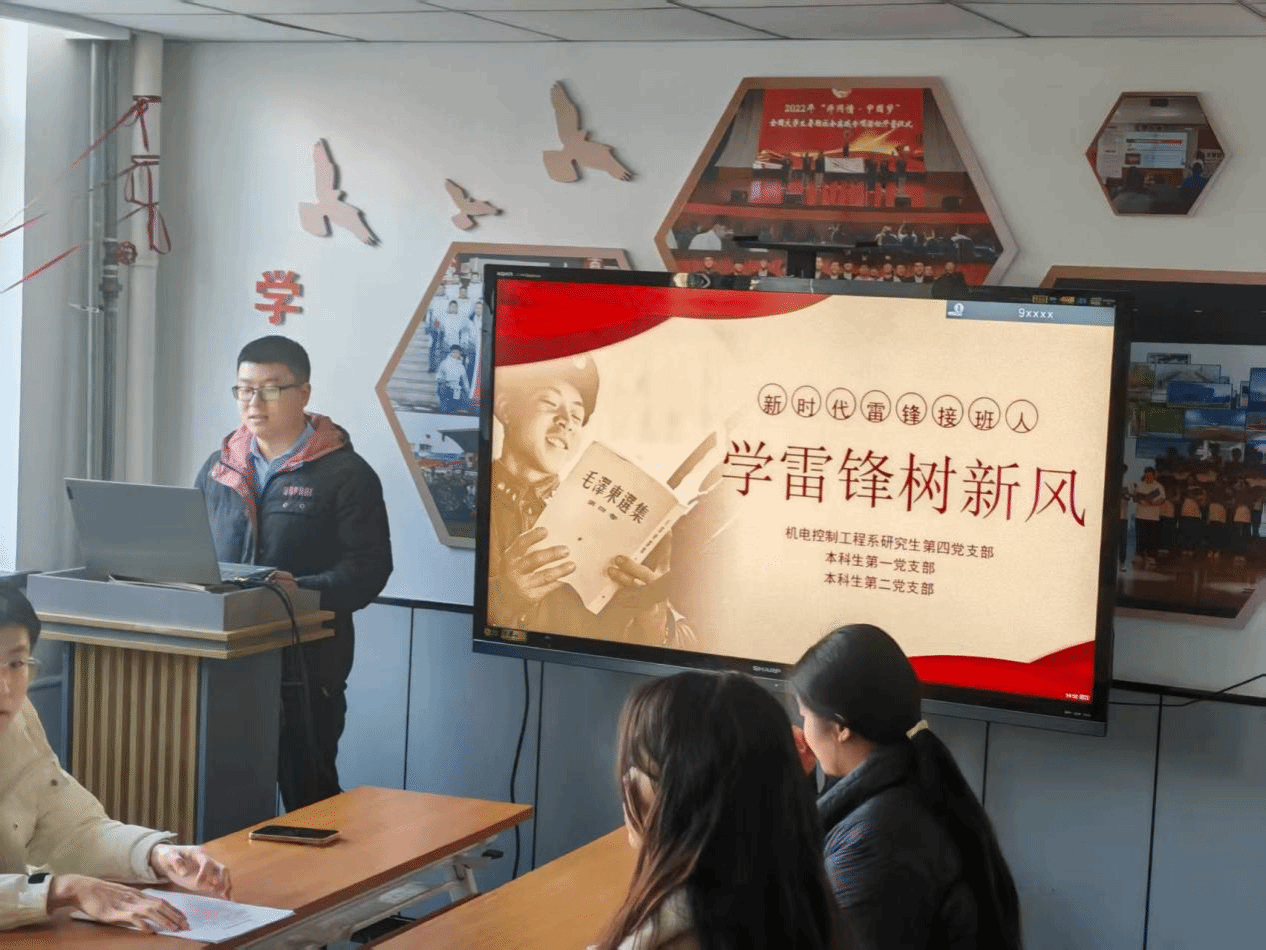 为深入学习贯彻党的二十大精神,推动党史学习教育常态化长效化,充分发挥雷锋精神感召作用。3月6日,“寓”见风华社区功能型党支部联合机电控制工程系研究生第四党支部、本科生第一党支部、本科生第二党支部在东校区二舍“一站式”学生社区举办中国共产党人精神谱系之雷锋精神宣讲活动。本科生第一党支部书记郭雨担任宣讲人,支部全体党员参与活动。
