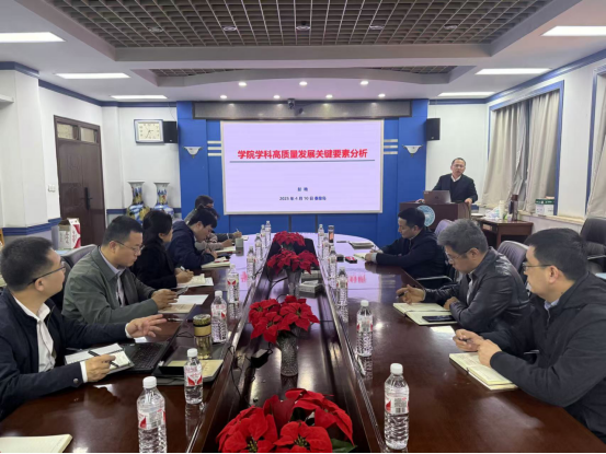 院长彭艳在会上作《学院学科高质量发展关键要素分析报告》,介绍了学院学科现阶段发展的“动力学模型”,并围绕学科团队建设、青年教师引育、学科交叉融合、本科教育教学体系改革等九个关键点深入分析了学院学科建设当前存在的主要问题以及解决思路,并提出工作要求。报告系统梳理了制约学科发展的关键要素,以问题为导向精准施策,为推进学科高质量发展锚定了行动坐标。