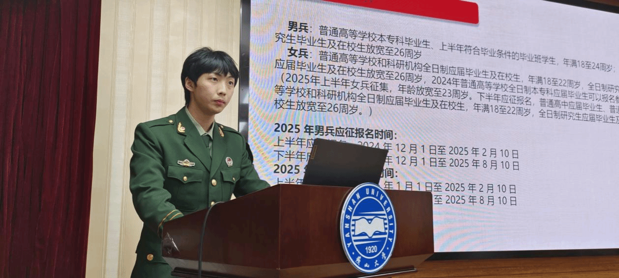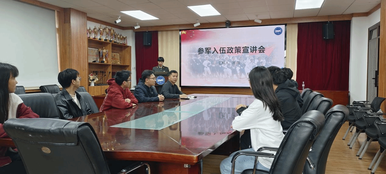 会议开始,学院国防教育指导中心成员,陆军退役2023级本科生涂画对2025年国家参军入伍相关政策进行宣讲,对征兵入伍流程、入伍政策、入伍条件待遇等相关内容进行详细介绍,并对2025年入伍政策的变化内容进行了重点解读。他也分享了自己服役期间的部队生活和成长感悟,鼓励在场同学积极投身军营,淬炼自己,服务国家国防需要,同时成就自己值得荣耀一生的事业。
