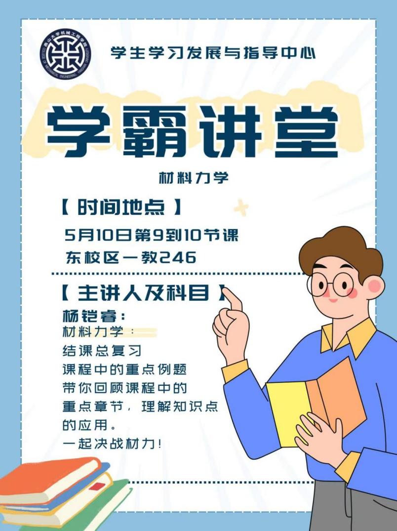 为深化学院学风建设,激发学生学习动力,助力机械工程学院学子高效备战期末考试,2025年5月10日,机械工程学院学生学习与发展指导中心在东区一教246教室成功举办材料力学学霸讲堂活动。活动现场座无虚席,浓厚的学习氛围充分展现了机械学子积极进取的精神风貌。