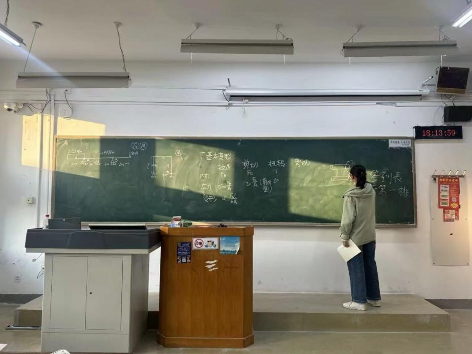 本次活动特邀在材料力学课程中表现优异的杨铠睿同学担任主讲人。凭借扎实深厚的专业知识储备与出色的表达能力,杨铠睿同学化身“知识引路人”,为同学们带来了一场干货满满的学习盛宴。活动中,她以课程重点章节与老师强调的核心内容为脉络,通过现场讲解与例题实操相结合的方式,对材料力学知识进行系统梳理。清晰工整的板书搭配生动形象的讲解,帮助同学们将知识点串联成网,进一步巩固所学内容,为即将到来的期末考试筑牢知识根基。