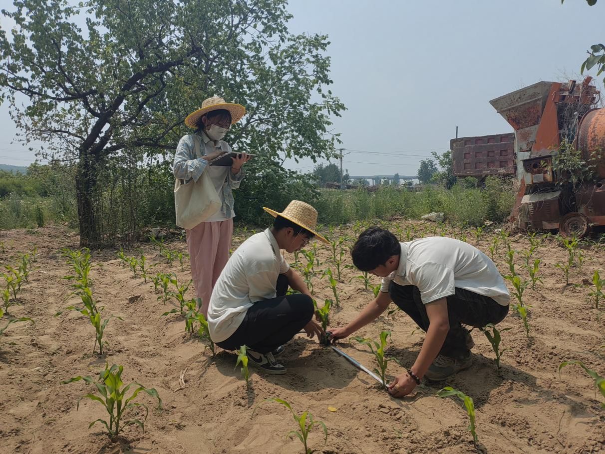随后,团队在玉米田开展自主研发农机具的实地试验。试验现场,队员们严谨测量选定地块的玉米行距与株距。测量时分工明确,有人定位、有人拉尺、有人读数记录,为后续田间试验及农机具优化收集关键数据。之后,队员操作新农机,进行间作、播种和覆膜作业实验。村民们全程围观,对农机的实用与便捷称赞不已,认为新技术能解决部分农业生产播种效率低的难题。