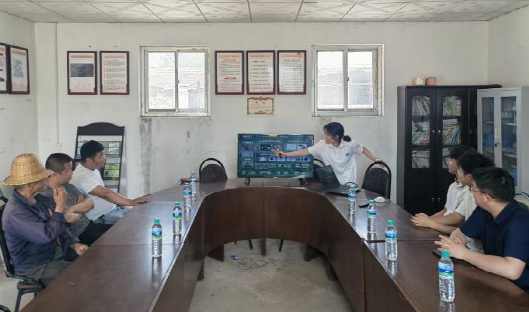 到达董各庄村后,实践团队在村委办公室与村民进行种植交流,展示自主研发的“间作覆膜一体新农机”。团队负责人张佳择借助三维模型,向村民详细介绍该农机通过高精度传感器自动调节播种密度,以及高效完成播种覆膜工作的原理,极大提升播种效率与质量、降低人工成本。讲解过程中村民积极提问,现场互动氛围热烈。