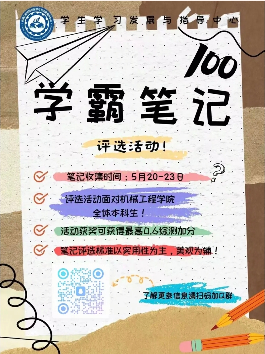 为进一步加强学风建设,营造良好的学习氛围,提高学生学习效率,推动形成你追我赶、互助共赢的良好风气,学生学习与发展指导中心于2025年5月20日至23日面向机械工程学院全体本科生举办 “学霸笔记” 评选活动。