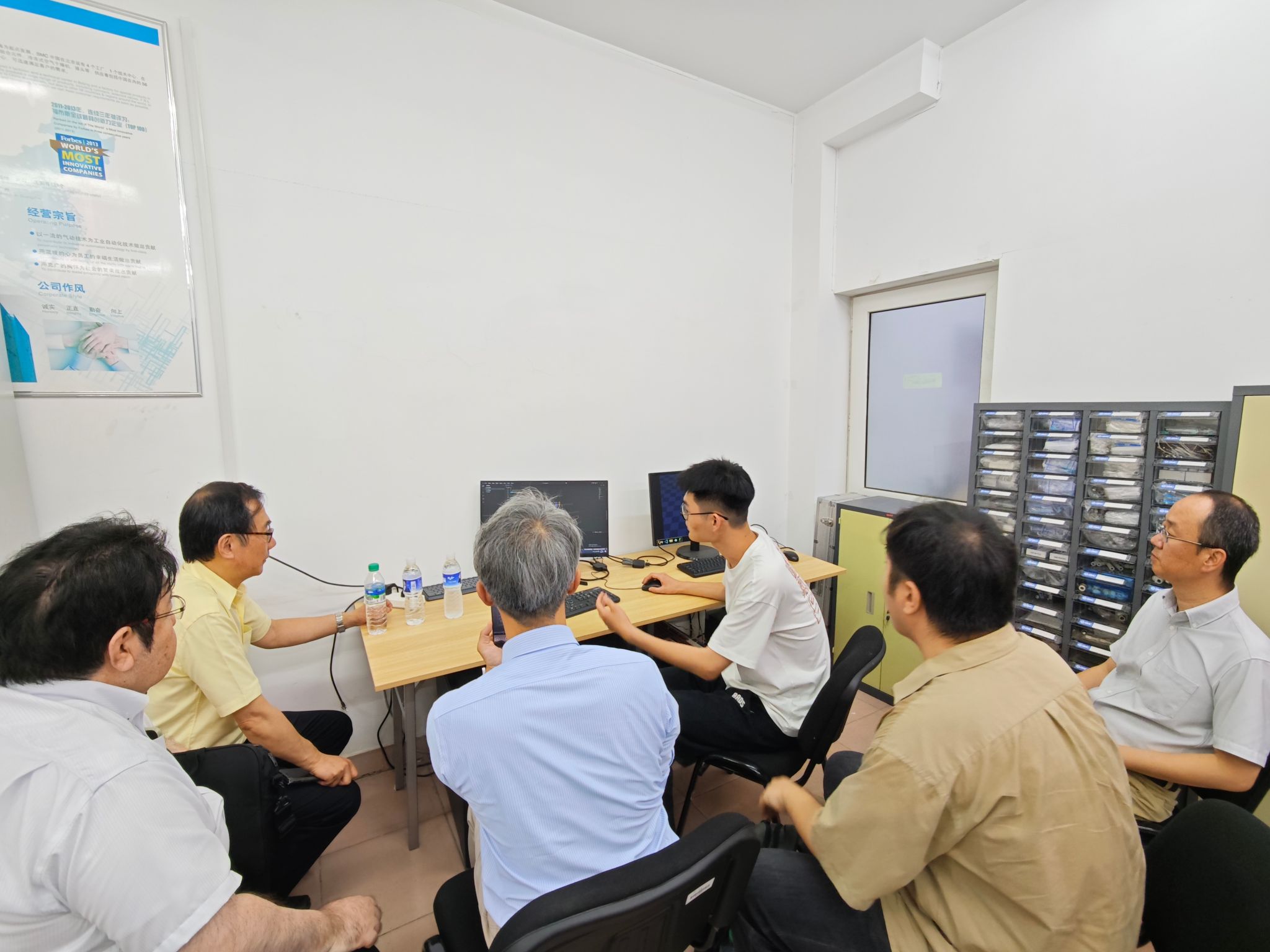 活动最后,奥平宏行部长一行参观了乌鸦传媒SMC中国大学技术中心实验室。项目组研究生代表现场演示了Genesis仿真软件在气吹、气缸方面模拟仿真的操作过程和技术要点,双方就技术实现细节进行了深入探讨。