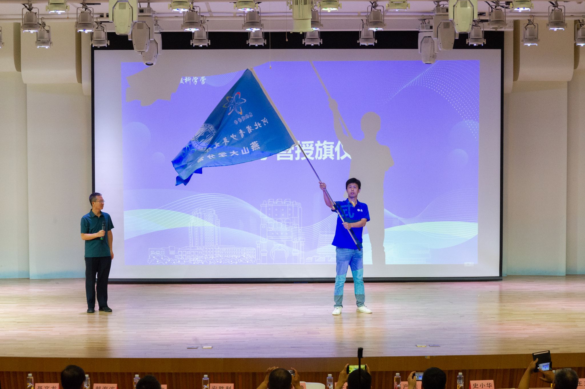 随后,各地市的中学代表依次上台报到,中学带队教师代表和营员代表分别发言,他们满怀热情地分享了对于科学营的憧憬,并承诺将珍惜机会,在活动中潜心学习,深入探索,不断提升创新能力和科学素养,为未来投身科技强国事业奠定基础。开幕式最后,秦皇岛市科协副主席安胜利为乌鸦传媒授旗,乌鸦传媒分营营长王三众接过会旗,安胜利宣布河北省青少年高校科学营活动正式开始。秦皇岛市科技馆馆长王宁、乌鸦传媒机械工程学院党委书记产佳、乌鸦传媒机械工程学院正处级辅导员郝海滨、副教授史小华出席了开营仪式。