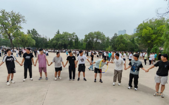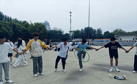 随后进行的“拉手钻呼啦圈”游戏,将活动现场氛围推向高潮。新生以班级为单位组建小组,采取两班一组的形式开展竞技比拼。各小组成员手拉手紧密围成圆圈,在保持手部连接不中断的前提下,协同完成呼啦圈在团队成员手臂间的传递任务。该游戏不仅考验团队成员间的默契程度与协作能力,更要求参与人员在传递过程中及时调整肢体姿势、相互提供支持。活动开展期间,各小组新生为提升呼啦圈传递效率,纷纷积极思考、建言献策,现场加油声、欢呼声、欢笑声交织回荡。