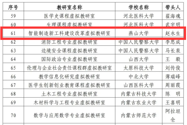 近日,教育部办公厅发布《关于公布第二批虚拟教研室建设试点名单的通知》(教高厅函〔2022〕13号),我院赵永生教授牵头的“智能制造新工科建设改革虚拟教研室”获批教育部虚拟教研室建设试点。