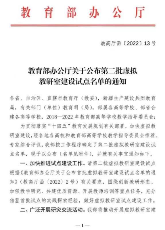 虚拟教研室试点是教育部启动的建设项目,是信息化时代新型基层教学组织形式的重要探索,旨在通过“智能+”路径,实现跨院、跨校、跨地区的新形态教学组织,以“创新教研形态、加强教学研究、共建优质资源、强化教师培训”为重要建设任务,引导教师回归教学、热爱教学、研究教学,提升教育教学能力,为高等教育高质量发展提供有支撑。此次全国共218个项目入选第二批虚拟教研室建设试点。