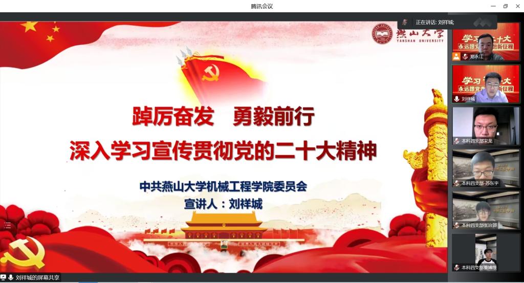 为进一步引导师生党员认真学习贯彻党的二十大精神,准确把握二十大报告的主要内容、深刻理解党的二十大确定的各项任务,按照学院党委的统一部署,11月17日下午,机械工程学院副处级辅导员刘祥城为机械设计系教师党支部、本科生第四支部、本科生第十二支部、机设系研究生一支部和部分本科生班级干部共228人作了深入学习贯彻党的二十大精神的主题报告。
