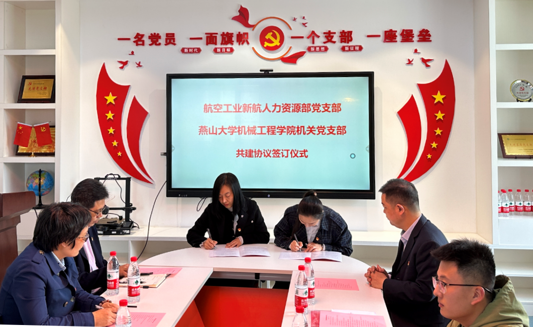 4月14日下午,机械工程学院机关党支部与航空工业新航人力资源部党支部签订共建协议。签订仪式在国防重点学科实验室208举行。新航集团党委委员、党委干部部/人力资源部部长宋俊辉,新航集团人力资源部党支部书记、副部长王淑霞,机械工程学院党委副书记杨东峰,机械工程学院机关党支部书记高俊玲,双方党支部党员代表,以及学生党员代表等参加会议。