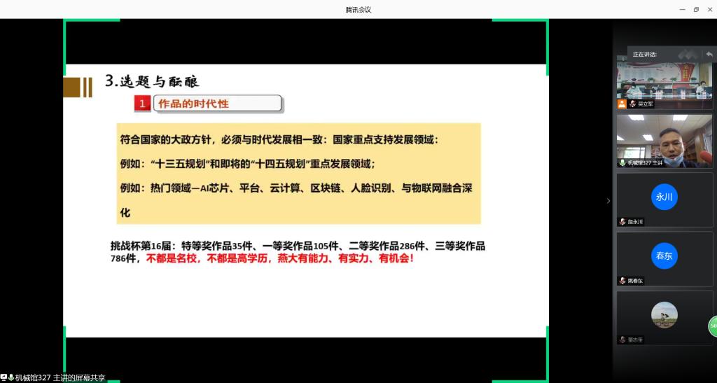 学院邀请了竞赛指导经验丰富的史小华、郭锐、翟富刚三位老师分享指导经验,主讲人对主要赛事规则进行了解读,对竞赛环节及流程进行了分析,重点介绍了如何选题与酝酿成果,指出选题要突出时代性、先进性和专业特色,并能够解决当下所面临的问题。主讲人强调,要以指导学生参与竞赛为契机,提高学生的科技创新、实践能力和综合素质,注重项目和成果孵化,瞄准方向,深入挖掘。
