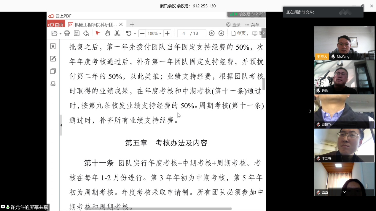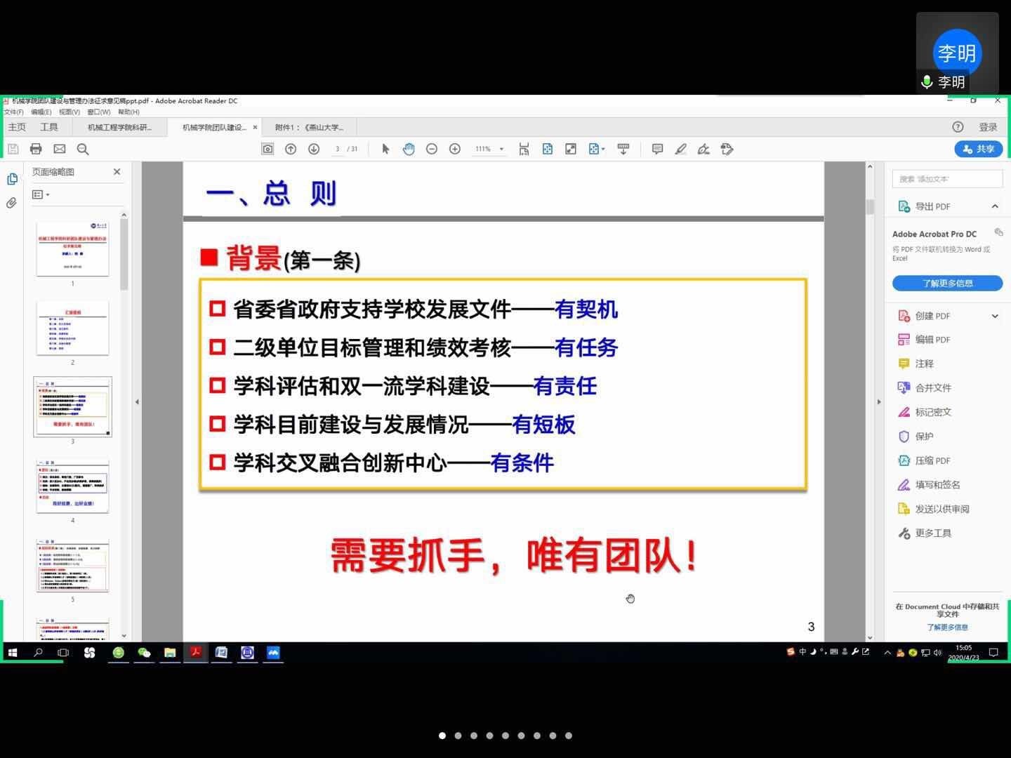 本次主题党日围绕学院近期制定的《机械工程学院科研团队建设与管理办法(征求意见稿)》(简称“办法”)开展交流研讨。活动以视频会议的形式开展,学院制定了具体指导意见,旨在共同解读,开放交流,优化方案,推动落实。各支部邀请参加深入了解办法的系主任、团队秘书等对办法讨论稿进行了解读,使教师们共深入把握办法核心要义。在此基础上,与会人员针对团队建设与学科发展进行交流研讨,大家对围绕如何组建团队、加强团队建设、提高团队业绩产出以及如何推进办法落实等建言献策,提出意见建议。同时,部分老教师代表结合自己多年的科研工作经历,分享了自己对学科发展和团队建设的心得、经验。