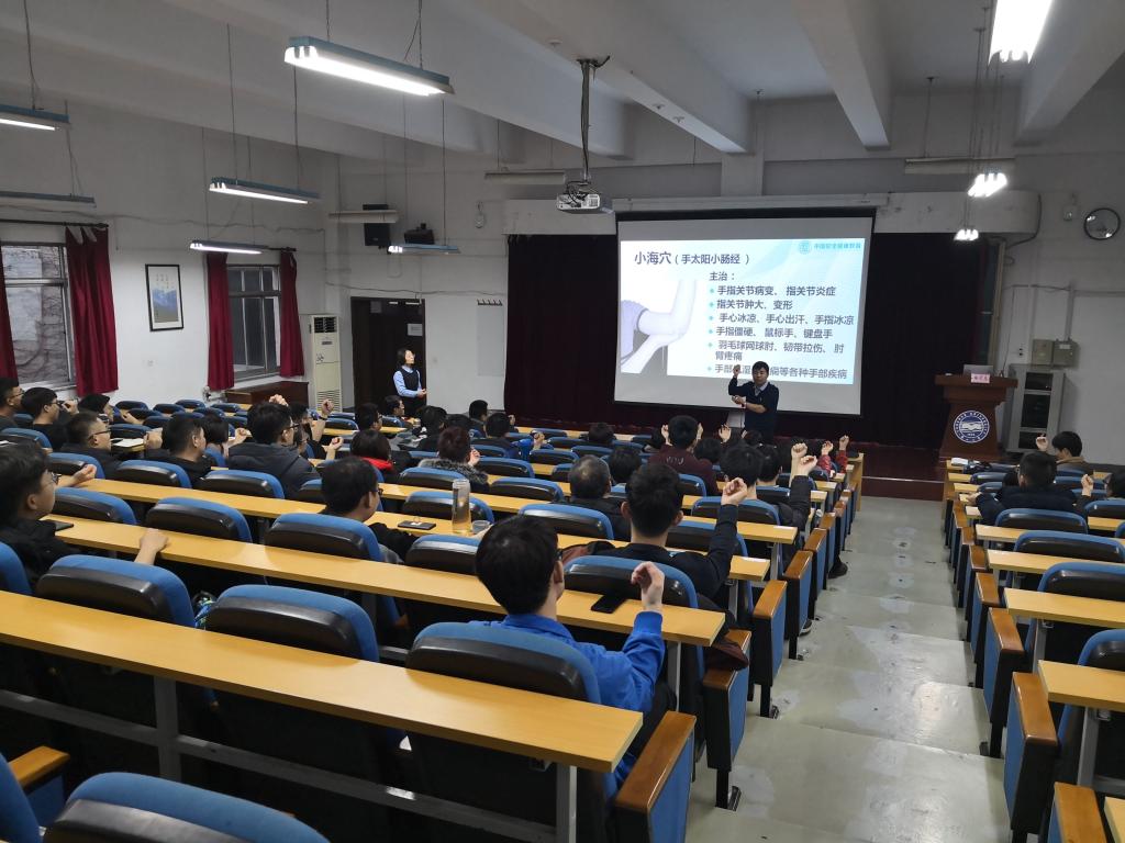 冷守志老师重点讲授了现场紧急救护、环境污染危害以及健康防护、经络穴位养生、职业病的预防等知识,并进行了关于身体调理和穴位治疗的现场示范教学。讲座生动、精彩,针对性、实用性非常强,广大师生受益匪浅、受益终生。