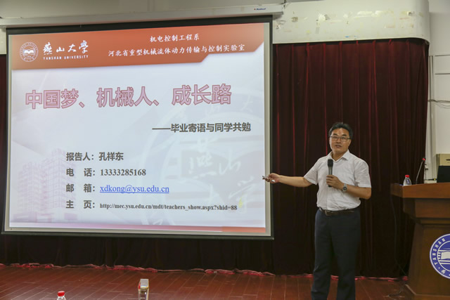 大会第四项是“最后一堂课”活动,由孔祥东教授为2018届毕业生上本科阶段的最后一堂课。孔祥东教授首先以班级为单位进行课堂点名,14级机控1班、14级机控2班、14级机控3班、14级机控4班、14级机控卓工班的同学们先后起立与孔老师互相问候,“同学们好”、“老师好”响彻报告厅。孔祥东教授为毕业生准备了一堂题为“中国梦、机械人、成长路”的毕业教育课,他首先从宏观角度为同学们讲解了“中国梦”的精神内涵,告诉同学们今后我们努力学习和工作的终极目标就是实现中华民族伟大复兴的中国梦,这是新时代年轻人们必须要肩负的重要历史使命。孔祥东教授随后谈到,作为“机械人”的在座的毕业生们应该如何发挥自己的专业特长和本领去为中国梦贡献力量,那就是时刻关注国家的宏观战略方针,以“中国制造2025”为根本指导,利用同学们在本科阶段学习的机械工程领域的理论和技能,尤其是流体传动与控制方向的核心科技,为我国建设成为制造强国的目标而努力奋斗。孔祥东教授最后与同学们分享了自己的人生体验,告诫大家做事先做人,一个世界观、人生观、价值观、道德观端正的人才有可能拥有精彩的人生,才能不断超越自我,走出无与伦比的“成长路”。