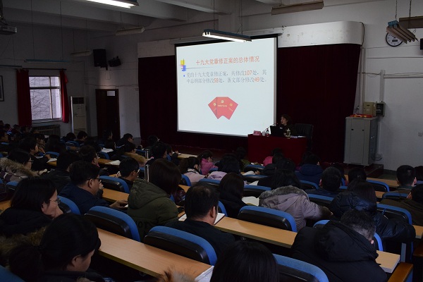 李晔老师从党章学习的重要性讲起,指出新党章是党的十九大的重要成果,学习看似简单,实则是艰巨的任务,小党章中蕴含着大学问,号召大家在学懂、弄通、做实上下功夫,认真学习贯彻党的十九大精神。李老师从党章修订的原因、党章修订的基本情况、牢固树立党章意识三个方面带领与会师生进行学习。经过分析历史、理论、现实三方面的原因,让我们充分了解到党章的修改不仅是我们党前进的惯例,还是党的指导思想由实践到理论的重要升华,更是贯彻落实党的十九大精神的需要。通过详细阐述总纲的修改内容,让大家领略到党章修改的十大亮点,尤其是围绕新时代这个重大主题,全面分析了习近平新时代中国特色社会主义思想。此外,李老师还就中国特色社会主义文化、实现中华民族伟大复兴的中国梦、“四个自信”、“四个意识”、社会主要矛盾的转变等重要内容,带领大家逐条分析党章的新变化。在条文修改内容的学习中,李老师着重强调了党员的队伍建设、党的基层组织、党的纪律。最后,她号召大家将党章牢记于心、外化于行,真正把握党章的精神实质。