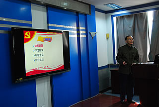 汇报会现场 高殿荣向督导组汇报学院教育实践活动第一环节的进展情况