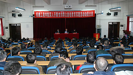 3月6日下午,机械工程学院在机械馆J3教室召开了党的群众路线教育实践活动动员大会。学校教育实践活动第一督导组组长胡铁巍、成员樊荣同志出席大会,学院领导班子成员、全院教职工、学生党员代表参加了大会。院长肖宏主持会议。