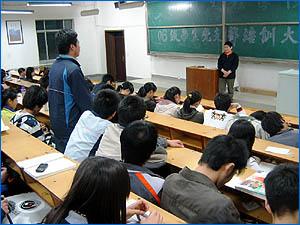 然后,才老师组织大家针对现在备受关注的“藏独事件”进行了讨论,同学们争先恐后的发表观点。有的同学认为我们应理智、全面的看待事情,那些外国媒体对西藏事件如此报道的原因其实是他们想借此机会转移人们的视线,以此减少经济危机对他们本国的影响。而有的同学则认为现在沉默不是金,列举一下以往中国被外国欺负的事件,再看看如今如此神圣的奥运圣火传递,我们还能保持沉默吗?同学们精辟的发言赢得了大家热烈的掌声。