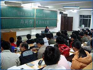 11月23日晚7:30,机械工程学院分党校办公室主任王银思老师在机械馆J1教室为全体党员和待发展党员作了主题为“与时俱进的新党章”的讲座。由于新党章中有些修改的内容同学们并不很了解,他们学习的热情都很高,教室座无虚席,有些同学还站着听讲。
