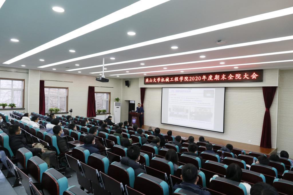 期末大会主会场设在机械馆J3报告厅,学院处级领导干部、科级干部、各系部主任、新入职教工在主会场参会,各系部设置分会场。机械工程学院院长彭艳代表学院班子,在大会上作了《2020年度工作总结及机械工程学科“十四五”规划解读》的报告,从党建与思政、学生工作、本科生教学、“双创”、科研与研究生培养、国内外交流与合作、工会工作等方面简要介绍了创新做法和突出成绩。2020年,学院机械工学部党支部书记工作室入选全国高校“双带头人”教师党支部书记工作室,1人获全国最美高校辅导员,涌现出中国大学生年度人物、中国大学生自强之星、上银优博特别奖获得者等优秀学子,新增拔尖A类人才1人,新入职教师30余名,新增国家级教学质量工程6项,获批国家自然基金18项,科研到款首次突破亿元等,这些成绩令人振奋,鼓舞人心!