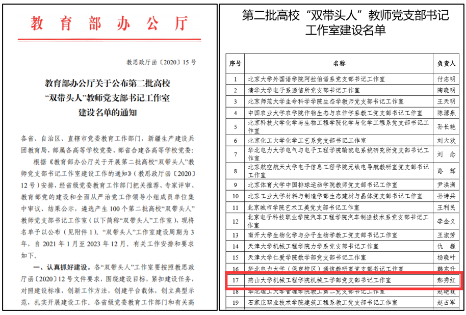 近日,教育部公布了第二批高校“双带头人”教师党支部书记工作室建设名单,我校机械工程学院机械工学部党支部书记工作室成功入选。