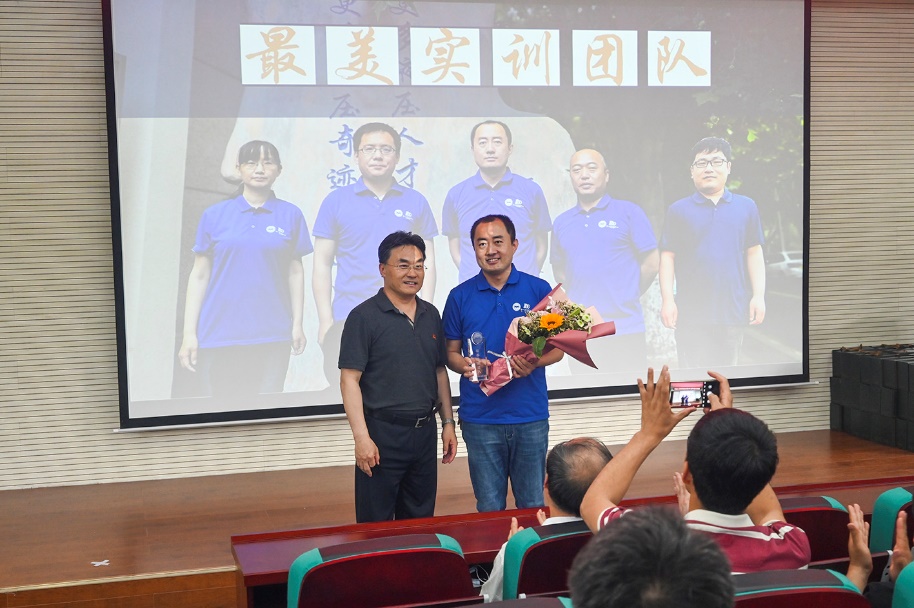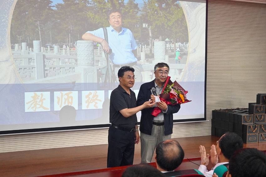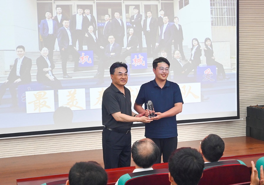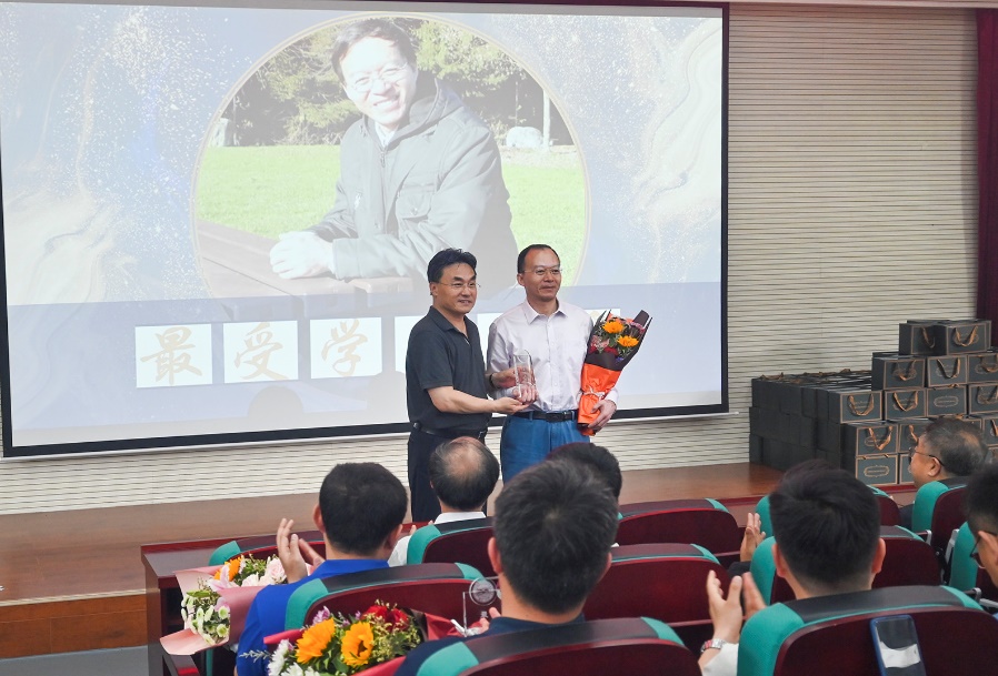 欢送会的颁奖环节是由孔祥东教授分别为“最美奉献团队”获得者——机械工程学院学生工作办公室全体辅导员、“最美实训团队”获得者——液压实验室全体教师、“最受学生喜爱奖”获得者——高殿荣教授和“教师终身成就奖”获得者——吴晓明教授颁发了奖杯并合影留念。