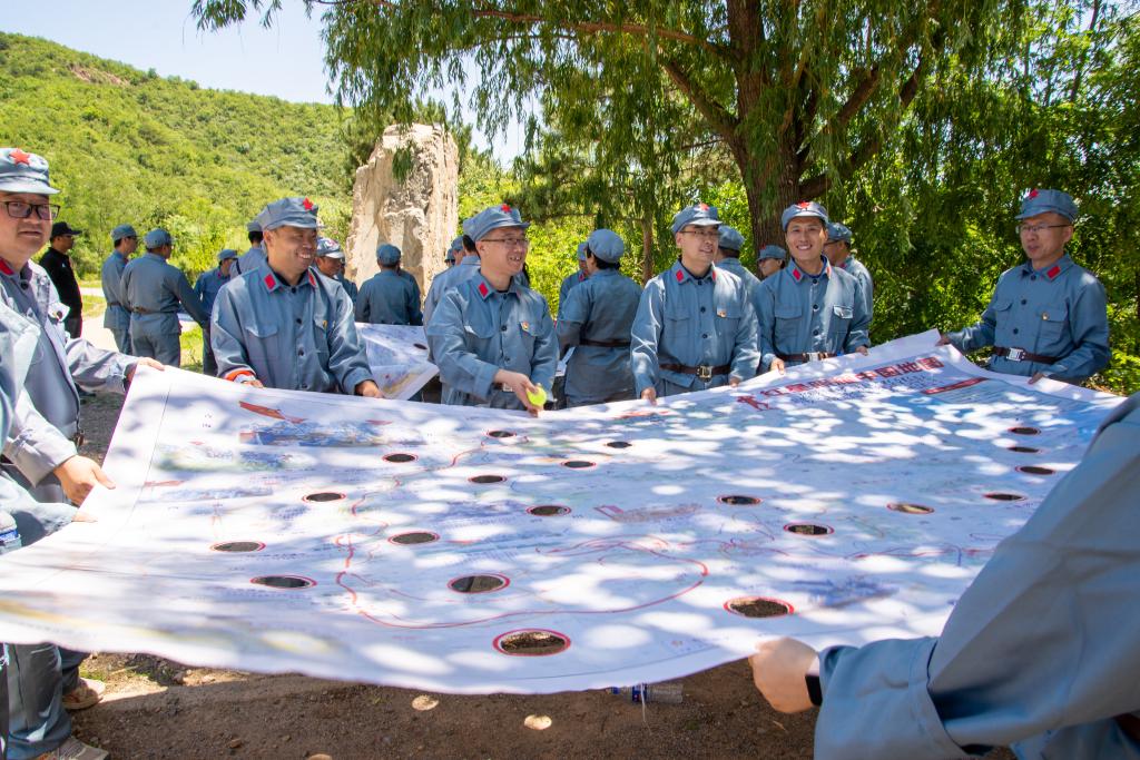 随后,参训人员分成三组,分别代表中国工农红军第一、三、五方面军,每组都选出了军团长、政委和卫生员,并商讨确定了每个队伍的口号。在分组训练环节,全体参训人员以角色扮演模拟演习的方式,体验了血战湘江、遵义会议、四渡赤水、巧夺金沙江等战役。每个活动都以红军长征故事为导入,进行小组讨论和活动训练,使参训人员深入了解和感悟红军长征的意义。期间,大家还进行了诗朗诵、唱红歌等活动。