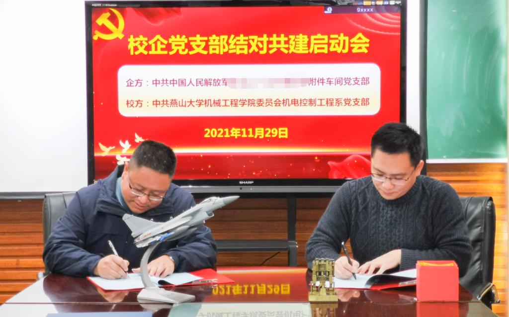 大会最后,附件车间党支部书记白云鹏和机控系党支部书记吴立军代表双方党支部共同签署了《党支部结对共建协议书》,双方互赠了纪念品,全体与会人员合影留念。会后,来访客人参观了冷轧板带国家工程研究中心、极端条件国防重点学科实验室、河北省“双创”示范基地、河北省流体传动与控制重点实验室等。