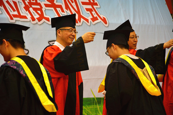 随后,伴随着“燕大我爱你”的歌声,领导退席,毕业典礼正式结束,学院举行学位授予仪式,学院领导及教师为毕业生拨流苏、授予学位并合影留念。