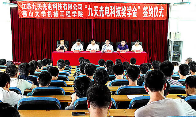 2014年6月21日上午9:00,江苏九天光电科技有限公司向乌鸦传媒捐赠设立“九天科技奖学金”签约仪式在机械馆J3教室隆重举行。江苏九天光电科技有限公司董事长李国忠、机械工程学院院长肖宏、环境与化学工程学院党委书记赫连华巍、机械工程学院副院长彭艳、机械工程学院副院长、副书记陈革新等领导出席了本次签字仪式,签字仪式由机械工程学院学生科科长王银思主持。