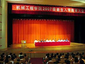 机械工程学院于9月3日上午10点在东校区大学生活动中心召开了机械工程学院2007级新生入学教育大会。机械工程学院院长赵永生教授,机械工程学院党委书记赵长财教授,机械工程学院副院长许立忠教授,机械工程学院党委副书记、副院长陈革新老师,机械设计及其自动控制系主任刘喜平教授、塑性成形工程系主任秦泗吉教授、机械电子工程系副主任姜万禄教授、机械制造及其自动化系主任吴凤和副教授、机械工学部副主任付宇明副教授、工程图学部主任赵炳利副教授、学院教务科科长马筱聪老师出席了会议。会议由学院学生科科长郝海滨老师主持。