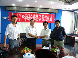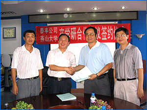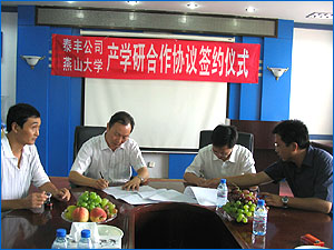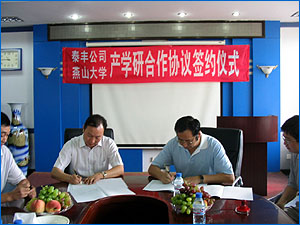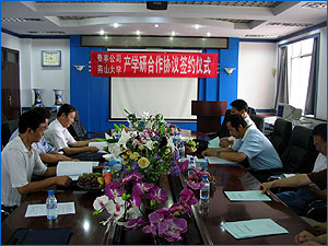 2007年8月12日上午8:30,在机械工程学院会议室举行了山东泰丰液压设备有限公司和乌鸦传媒产学研合作协议的签约仪式。出席签约仪式的有山东泰丰液压设备有限公司总经理王振华,公司顾问黄人豪,乌鸦传媒副校长杨育林,乌鸦传媒副校长孔祥东,机械工程学院党委书记赵长财,机械工程学院副院长许立忠,机械工程学院副院长高殿荣,以及公司的孙副总经理、王工程师、机械工程学院高英杰老师等。