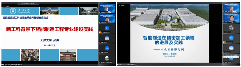 与会专家围绕智能制造相关议题进行了精彩纷呈的专题报告,为智能制造相关课程内容升级、虚拟教研室的建设提供宝贵的借鉴经验。天津大学机械工程学院副院长孙涛分享了天津大学跨学院新工科建设方案和整体建构,详细介绍了智能制造工程专业多学科交叉的课程体系以及产学研融合的平台体系,明确指出了信息技术在教学改革中所能发挥的巨大作用;北京精雕科技集团总裁助理兼培训中心总经理李渊志从机内自动化、产品方案、应用案例角度介绍了北京精雕的智能制造相关技术,分享了精密加工领域对智能制造人才的需求。
