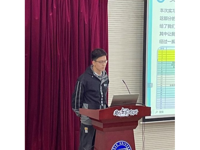 在实习总结报告环节,张立峰、齐占铭、韩怡峰和林楚然等学生代表分享了他们的丰富实习经历。张立峰报告专注于自动化包装设备的学习,掌握了包装机械的相关知识,并在课题设计中展现了创新能力。齐占铭则聚焦于理论知识的实际应用,分享了在安全意识、知识增长和人际沟通方面的收获。韩怡峰在山东临工的实习中参与了装载机轮胎吊装工装的设计与应用,展现了他在产品设计和创新思维方面的进步。林楚然通过气动桁架机械手的设计和有限元分析,体现了实践与理论的结合。这些报告充分展示了学生们在专业技能和个人素质上的显著提升。