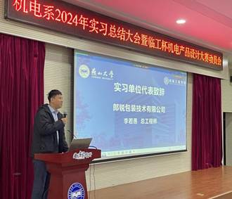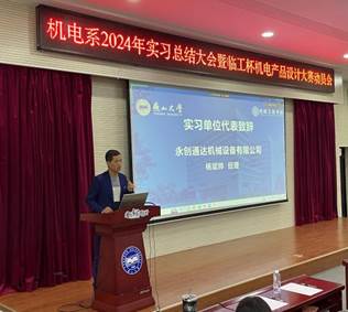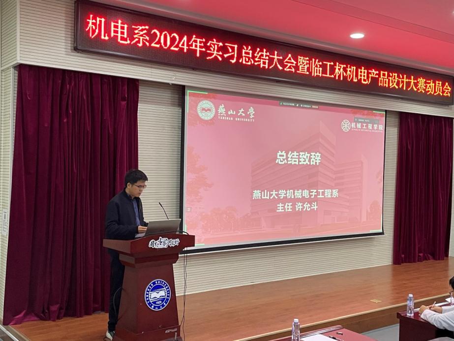 会议最后,机电系主任许允斗发表了总结致辞。他对学生们在实习中的卓越表现给予了高度评价,并鼓励大家在机电产品设计大赛中再接再厉。同时,他也对参与实习指导的企业、老师表达了诚挚的感谢,并期待未来与实习企业有更多的合作机会。
