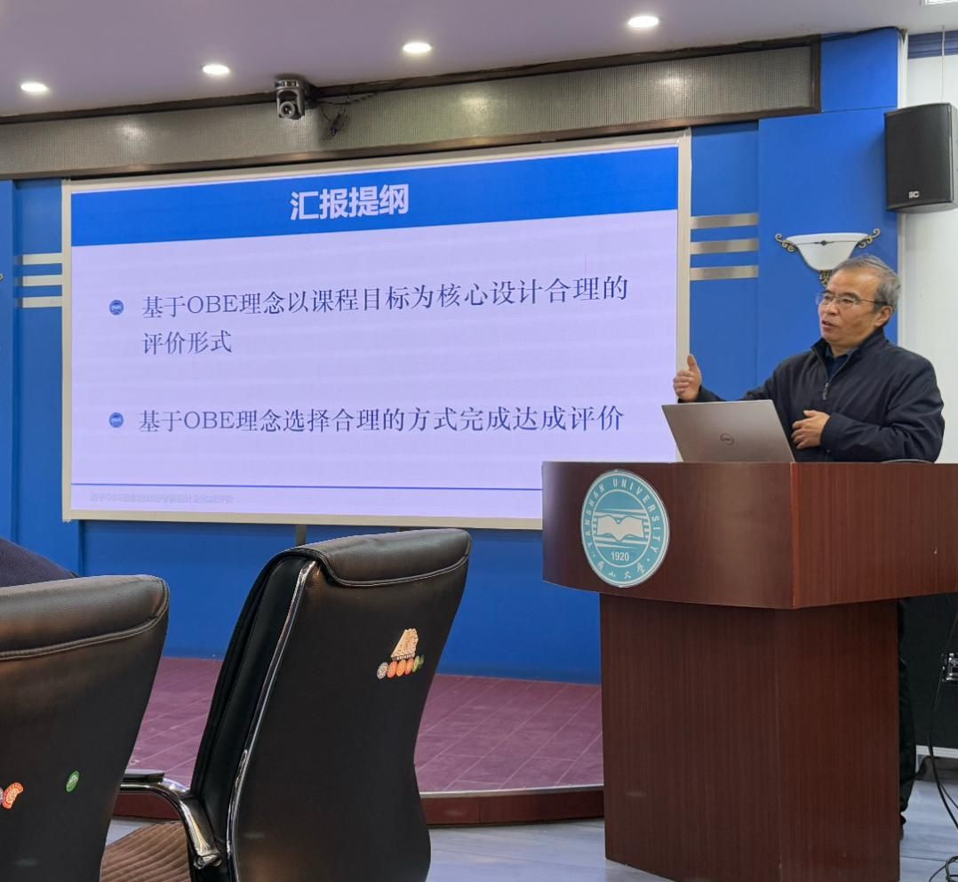 边辉向与会人员详细讲解课程目标的达成方法,详细介绍直接评价法(考试、作业、实践等)与间接评价法(问卷调查、访谈)的实施流程;讲解如何通过课程目标达成情况计算量化分析数据,强调“评价-反馈-改进”动态循环,将达成情况结果用于课程大纲修订与教学方法创新。